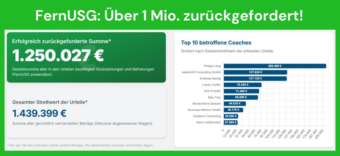 Allein Ende Februar 2026 kamen laut seiner Sammlung weitere Fälle hinzu. Rückforderungen von 21.490 Euro, 12.971 Euro oder 3.570 Euro wurden dort gerichtlich bestätigt. Für die betroffenen Coaches bedeutet das eines: Geld, das bereits vereinnahmt wurde, muss wieder zurück. Und das führt nicht wenige in die Insolvenz. Die Urteile berichten lediglich von der Forderung, aber nicht, ob sie auch eingetrieben werden kann.