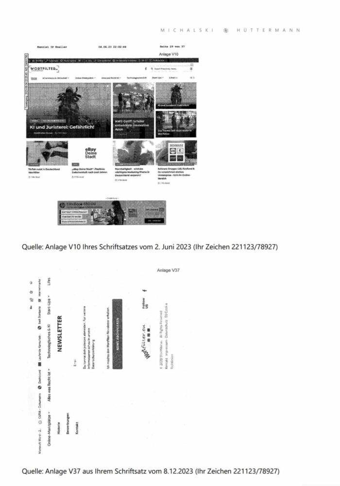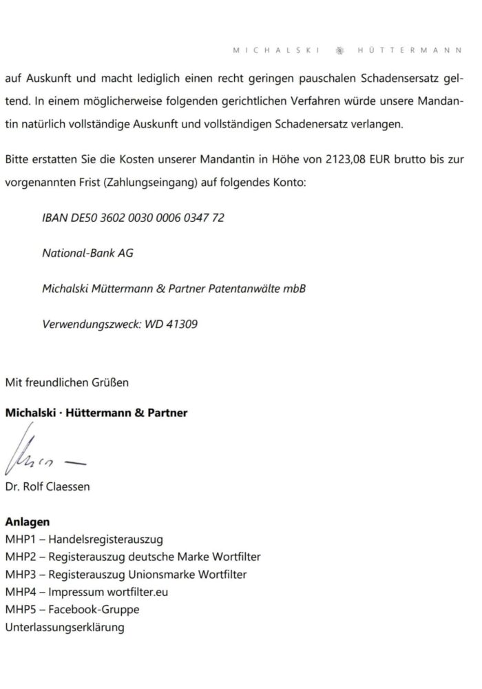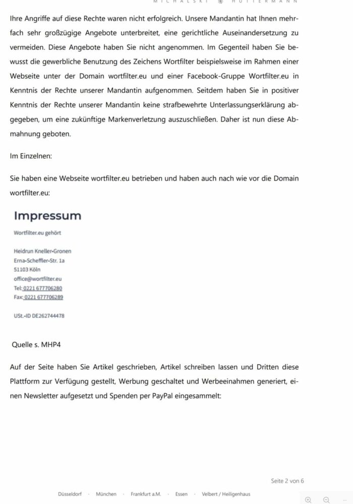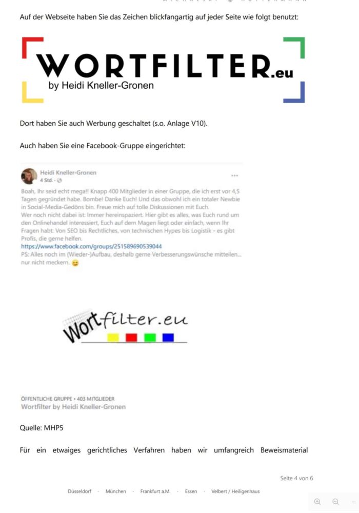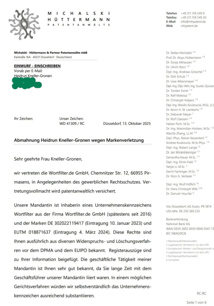 Es handelt sich hierbei um die Abmahnung gegen meine ehemalige Lebensgefährtin, Rechtsanwältin Heidi Kneller-Gronen (Kanzlei IP-Kneller), wegen der Verletzung meiner Markenrechte an der Marke „Wortfilter“.