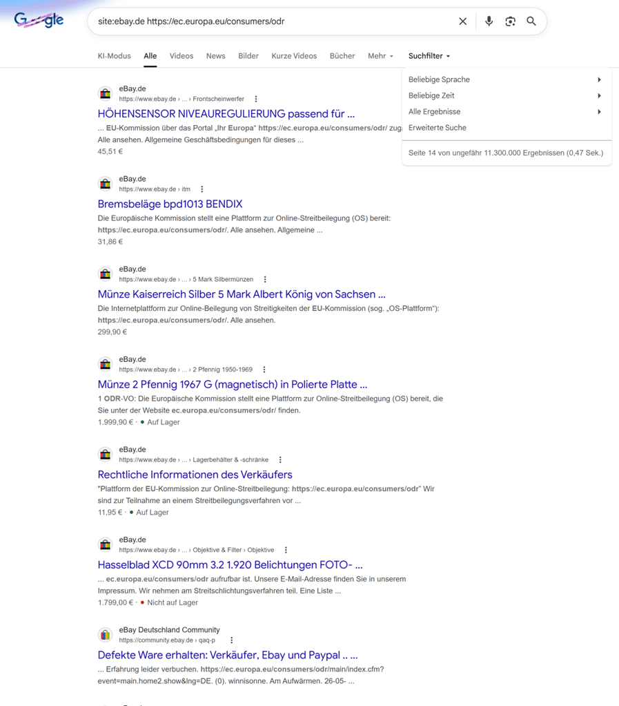 Trotz der Abschaltung der EU-weiten Online-Streitbeilegungsplattform (OS-Plattform) und der damit verbundenen Änderung der Informationspflichten tauchen in Angeboten, Shop-Rechtstexten und AGB auf eBay noch immer Millionen alter Verweise auf diese nicht mehr existierende Seite auf. Eine Auswertung aktueller Daten ergab, dass mehr als 11 Millionen Links zur früheren OS-Plattform auf eBay zeigen.