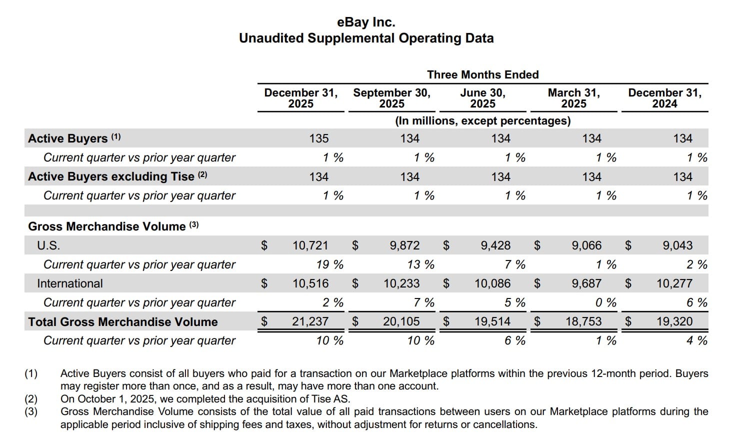 Für das Gesamtjahr 2025 meldete eBay ein GMV von 79,6 Milliarden US-Dollar. Das entspricht einem Wachstum von 7 Prozent. Der Umsatz lag bei 11,1 Milliarden US-Dollar, ebenfalls mit einem Plus von 8 Prozent gegenüber dem Vorjahr.