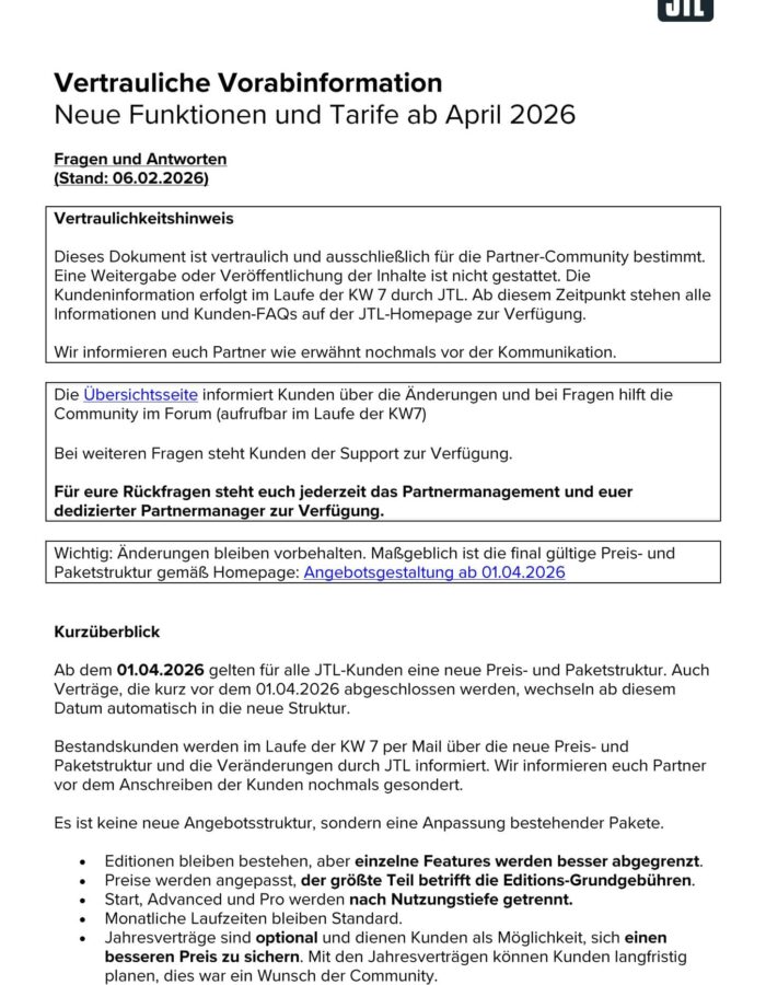 wortfilter.de liegt die interne Mail vor, die am 6. Februar 2026 an alle Servicepartner verschickt wurde. Einen Tag zuvor hatte JTL die Partner in einem Call vorinformiert. Öffentlich kommuniziert wird das Ganze erst in Kalenderwoche 7 – inklusive Landingpage und FAQ-Bereich, der aktuell noch hinter einem Passwortschutz verborgen ist.