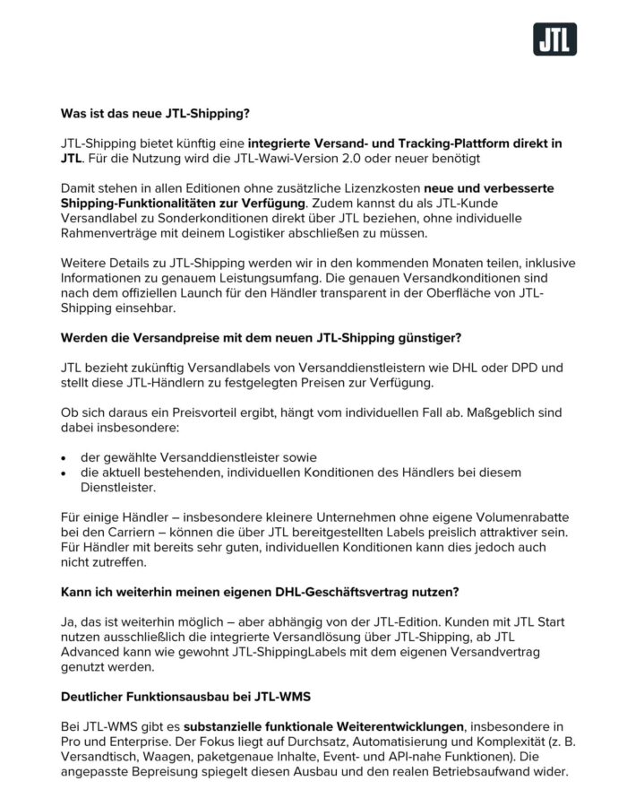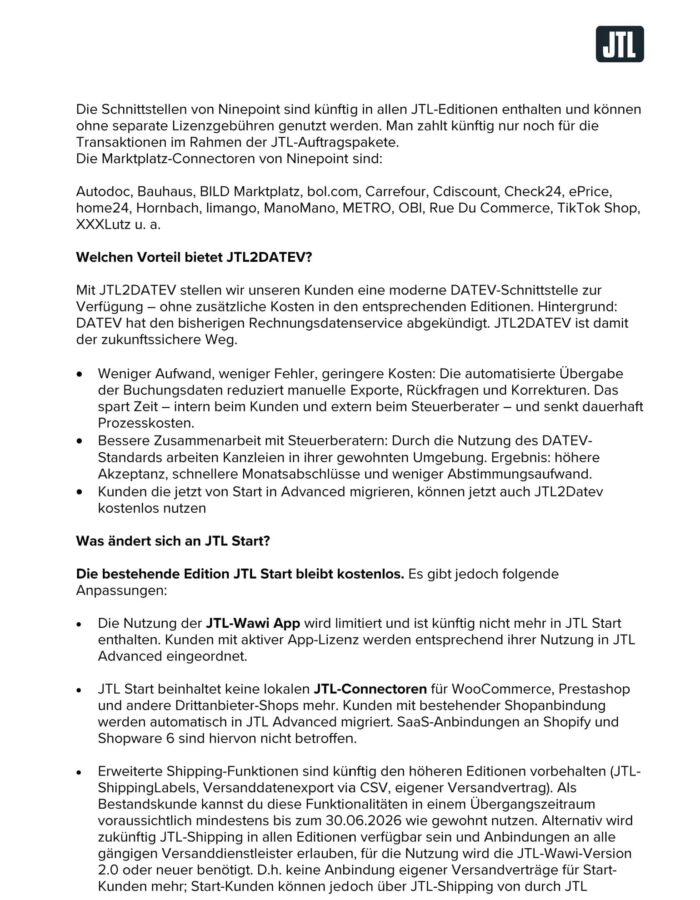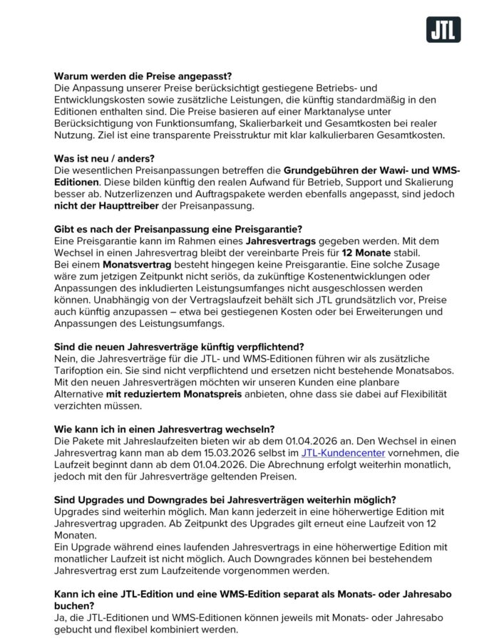 „Unabhängig von der Vertragslaufzeit behält sich JTL grundsätzlich vor, Preise auch künftig anzupassen – etwa bei gestiegenen Kosten oder bei Erweiterungen und Anpassungen des Leistungsumfangs.“