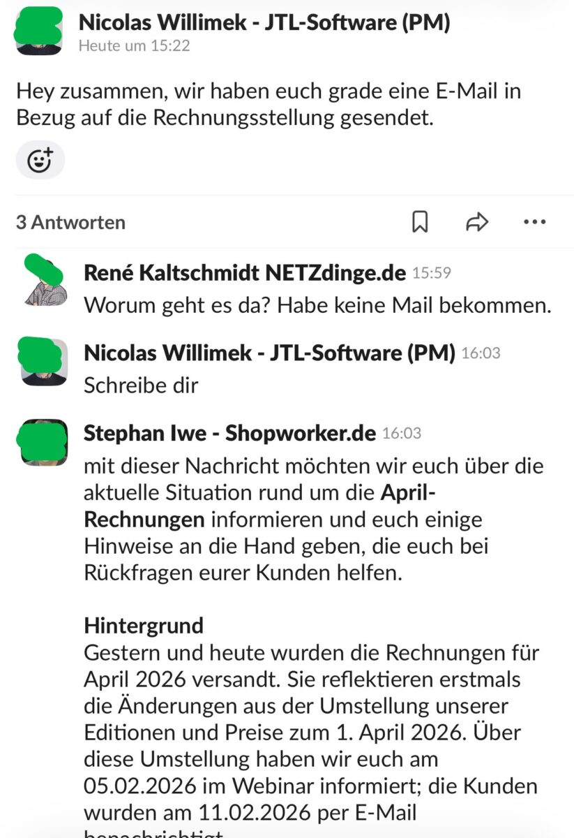 Besonders aufschlussreich ist ein Screenshot aus einem Slack-Chat, der ausschließlich JTL-Servicepartnern und JTL selbst zugänglich ist. Nicolas Willimek, Product Manager bei JTL, informiert dort am 17. April 2026 um 15:22 Uhr: „Hey zusammen, wir haben euch grade eine E-Mail in Bezug auf die Rechnungsstellung gesendet.“