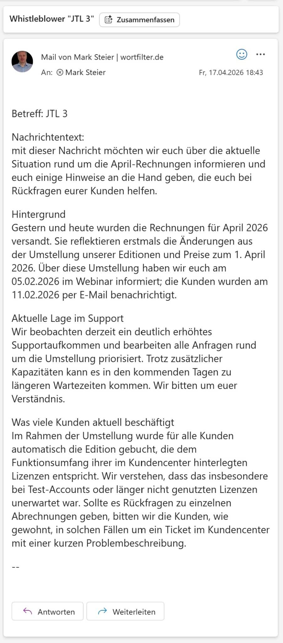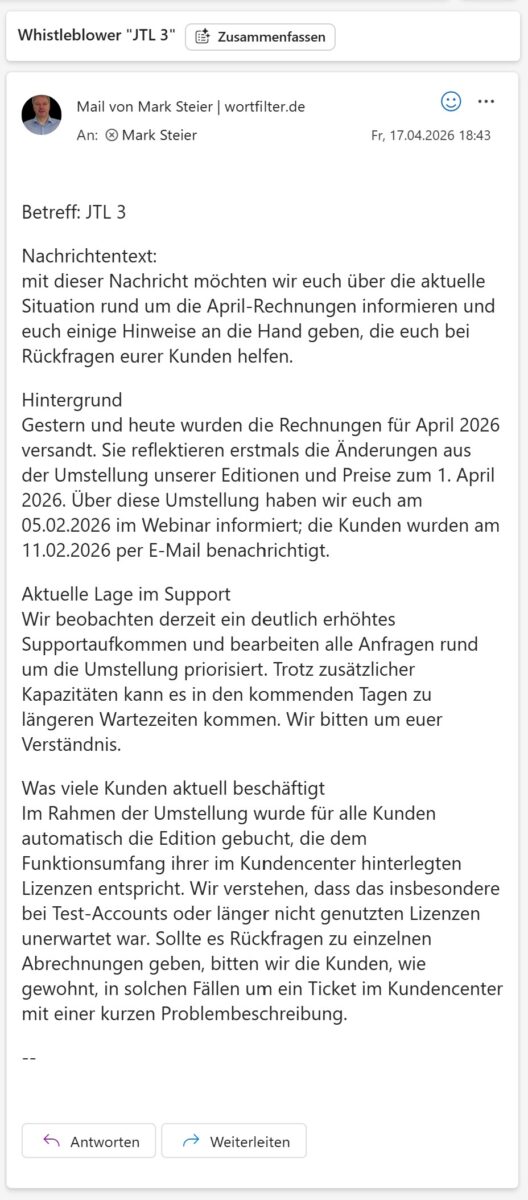 In der E-Mail, die JTL anschließend an Servicepartner verschickte – wortfilter.de liegt sie vor – heißt es zum Hintergrund: Die Rechnungen für April 2026 reflektieren erstmals die Änderungen aus der Umstellung der Editionen und Preise zum 1. April 2026. Über diese Umstellung habe man am 5. Februar 2026 im Webinar informiert, Kunden seien am 11. Februar 2026 per E-Mail benachrichtigt worden.