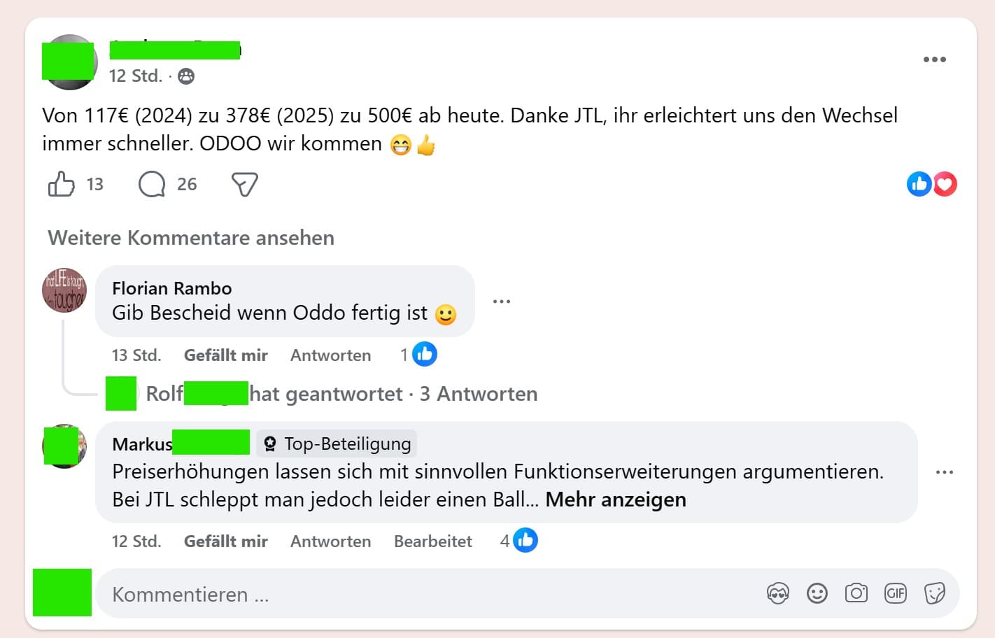 Die Liste der Betroffenen ist lang. Christian Erwin schreibt, er beziehe seit August 2025 keine Dienste mehr von JTL – und bekommt trotzdem eine Rechnung. Maik Krell berichtet von 1.054 Euro, die plötzlich fällig sein sollen, und hat die Kündigung bereits eingereicht. Andreas Bonn rechnet öffentlich vor: von 117 Euro im Jahr 2024 über 378 Euro 2025 auf jetzt 500 Euro monatlich. Sein Kommentar: „Danke JTL, ihr erleichtert uns den Wechsel immer schneller.“
