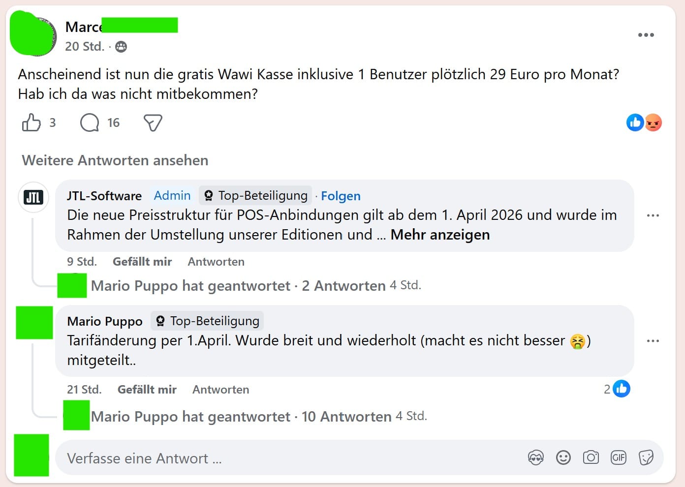 Seit dem Rechnungsversand am 16. und 17. April 2026 häufen sich in der offiziellen JTL-Facebook-Gruppe die Beschwerden. Das Muster ist immer dasselbe: Händler erhalten Rechnungen für Pakete, die sie nie aktiv gebucht haben. JTL hat im Rahmen der Umstellung jeden Kunden automatisch auf die Edition hochgestuft, die dem Funktionsumfang der im Kundencenter hinterlegten Lizenzen entspricht.