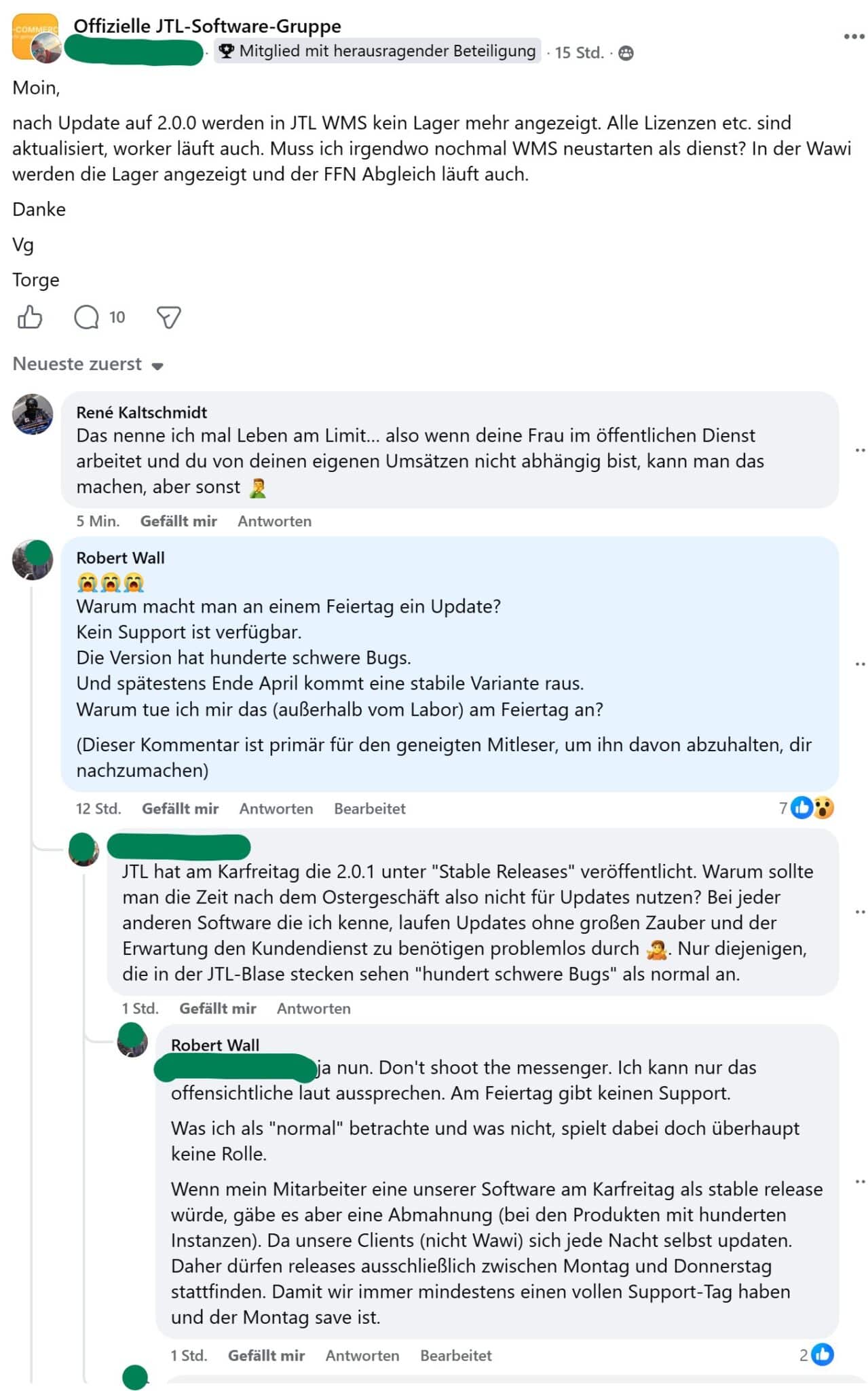 Wall richtete seinen Kommentar explizit an die „geneigten Mitleser“, um sie davor zu warnen, es Baumbach gleichzutun. Das hat was: Ein offizieller JTL-Servicepartner warnt öffentlich vor der aktuellen Stable-Version – in der offiziellen JTL-Gruppe. Und JTL? Schweigt.