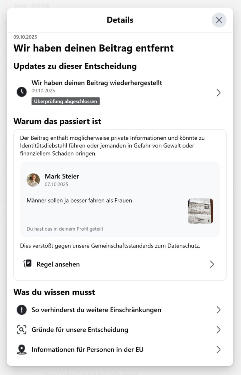 Am 7. Oktober 2025 teilte ich auf meinem Facebook-Profil einen Beitrag. Der Inhalt: der Screenshot eines Knöllchens mit meinen Adressaten. Facebook entfernte den Beitrag mit der Begründung, er könnte „private Informationen enthalten“ und zu „Identitätsdiebstahl“ oder „Gewalt“ führen. Das Konto wurde mit Einschränkungen belegt: u.a. keine Werbeanzeigen, keine Live-Videos, keine Anrufe.