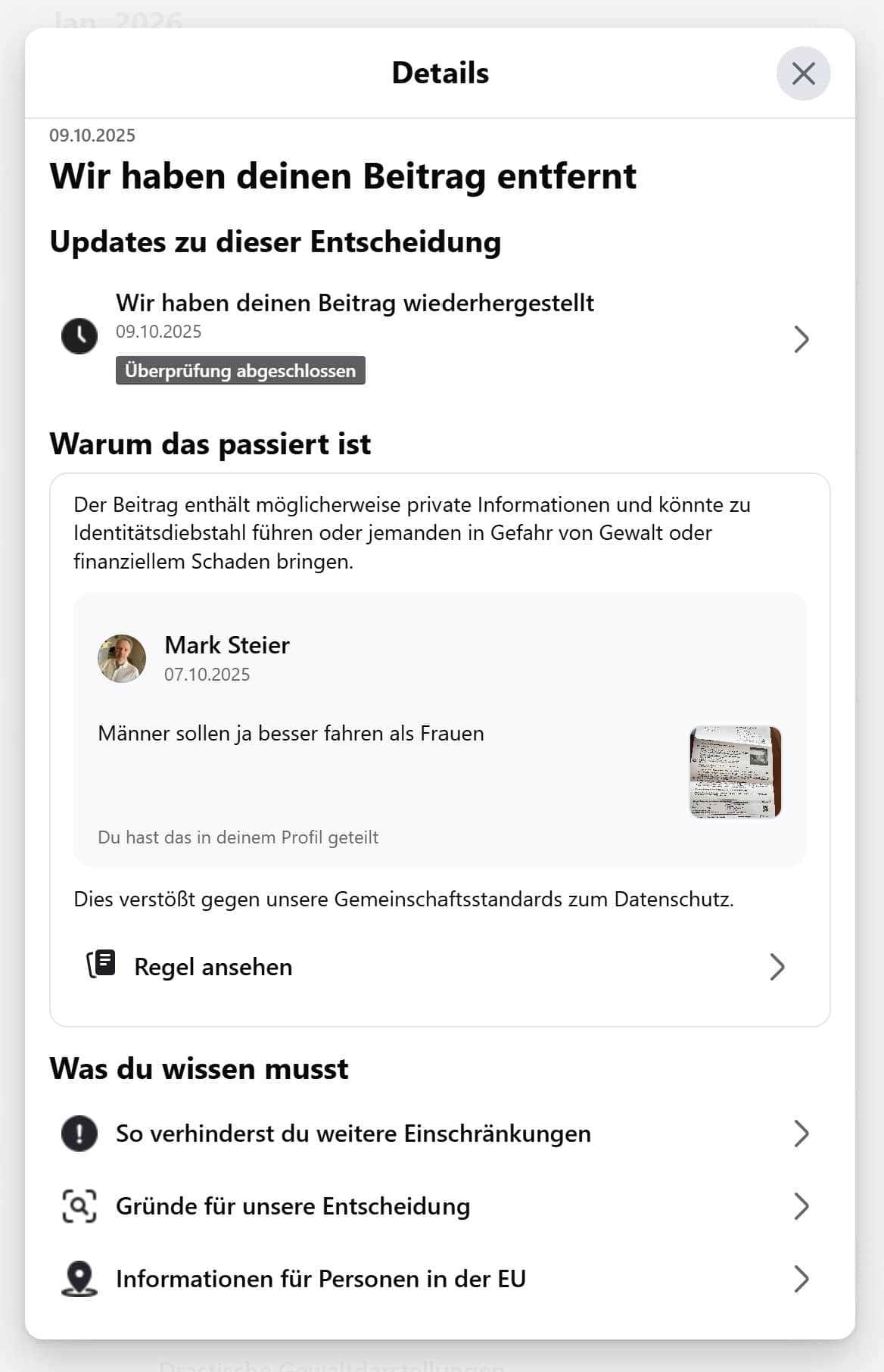 Am selben Tag, dem 9. Oktober, hatte Facebook den Beitrag nach eigener Überprüfung bereits wiederhergestellt. Die Einschränkungen blieben trotzdem bestehen. Das ist der Punkt, an dem der normale Nutzerpfad endet – und mein DSA-Verfahren begann.