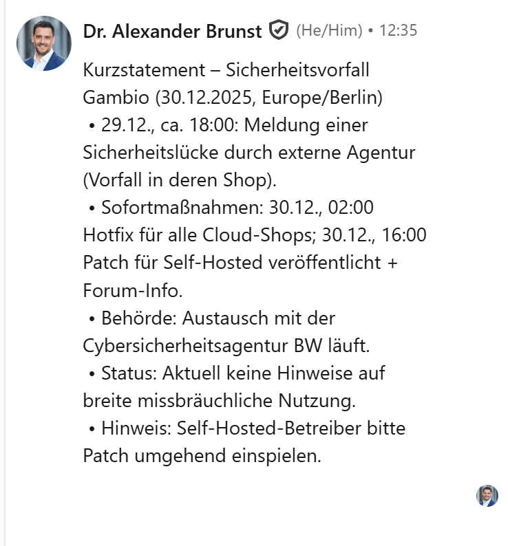 Der Vorfall zeigt, dass selbst gehostete Gambio-Shops ein attraktives Ziel für Angreifer zu sein scheinen – auch im staatlichen Umfeld. Unbekannte Sicherheitslücken, unerkannte Manipulationen im Checkout und fehlende Echtzeitüberwachung können dazu führen, dass Angriffe über Tage unbemerkt bleiben.