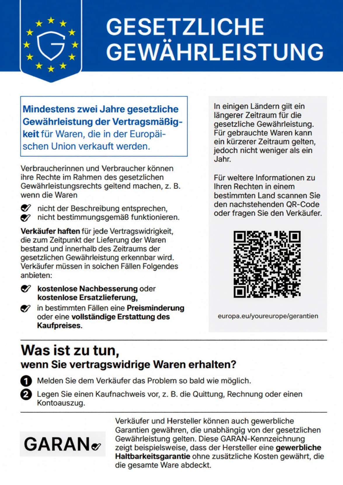 Gemeint ist die „harmonisierte Mitteilung über das gesetzliche Gewährleistungsrecht“ (Grafik aus Anhang I der Durchführungsverordnung (EU) 2025/1960). Für Online-Benutzeroberflächen muss sie farbig (RGB) angezeigt werden.